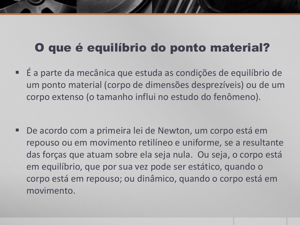 Equilíbrio de um Ponto Material. Ouça o texto abaixo! De acordo com a primeira lei de Newton, sabemos que um corpo está em repouso ou em movimento retilíneo e uniforme se a resultante das.