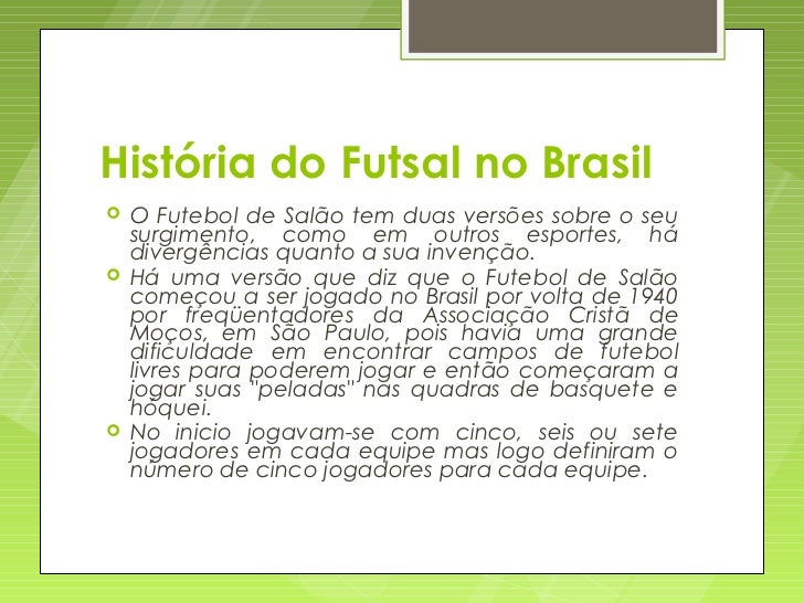 História e origem do futsal no Brasil. Logo depois de ser inventado, o futsal chegou ao Brasil em 1935.