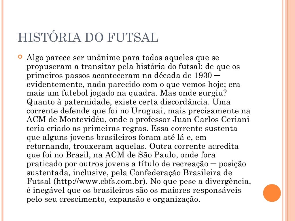 Regras. Videoaulas. História do Futsal. Há duas versões a respeito da criação do futsal: uma a atribui ao Brasil, em 1930, e outra ao Uruguai, em 1933. Em ambas, o futsal se apresenta como uma adaptação do futebol de campo.