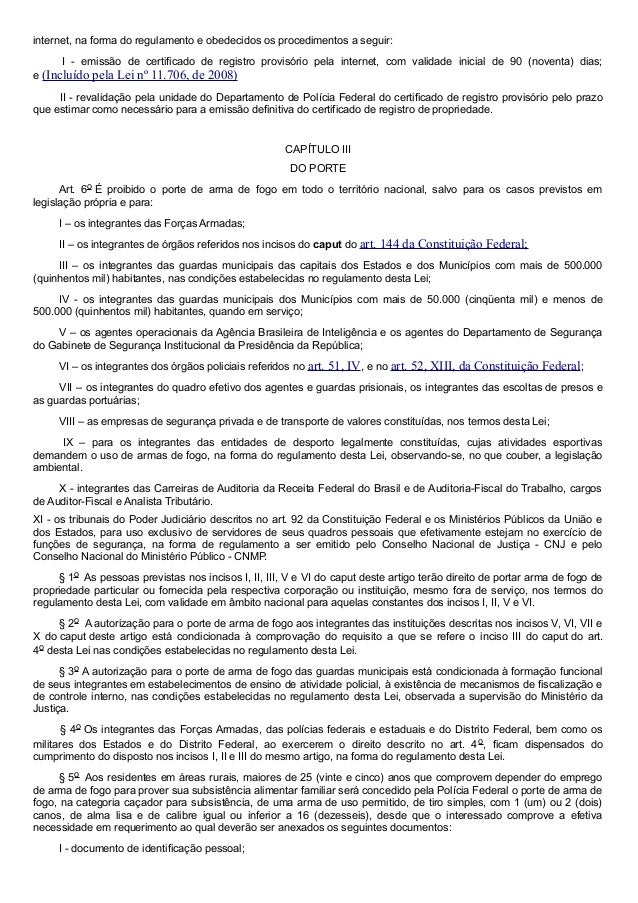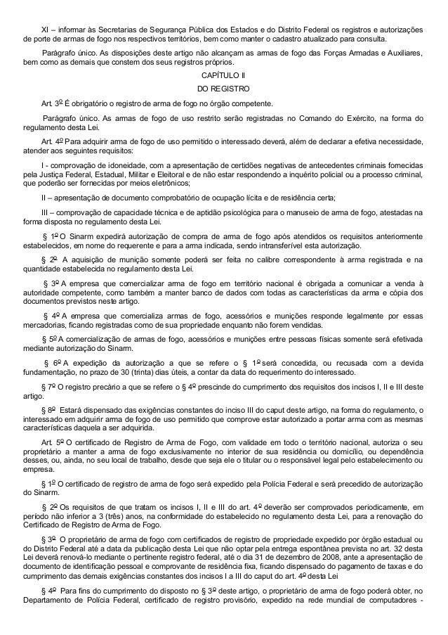 Publicado por Governo do Estado de São Paulo. O Presidente da República Faço saber que o Congresso Nacional decreta e eu sanciono a seguinte Lei: CAPÍTULO I. Art. 1o O Sistema Nacional de Armas (Sinarm), instituído no Ministério da Justiça, no âmbito da Polícia Federal, tem circunscrição em todo o território nacional. Art. 2o Ao.