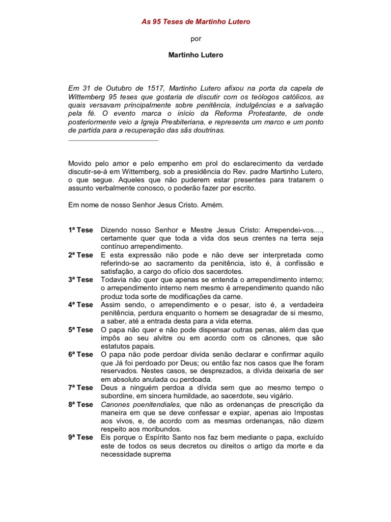 View PDF. As 95 Teses de Lutero [Essas teses foram afixadas na porta da igreja do Castelo de Wittenberg a 1o de outubro de 1517. Era esse o modo usual de se anunciar uma disputa, instituição regular da vida universitária e não havia nada de dramático no ato. Lutero confiava receber o apoio do papa pelo fato de revelar os males do tráfico.