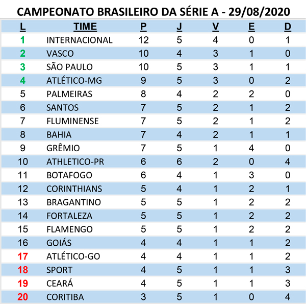 DESTAQUE ESPORTIVO Classificação do Campeonato Brasileiro Série A, resultados e próximos jogos