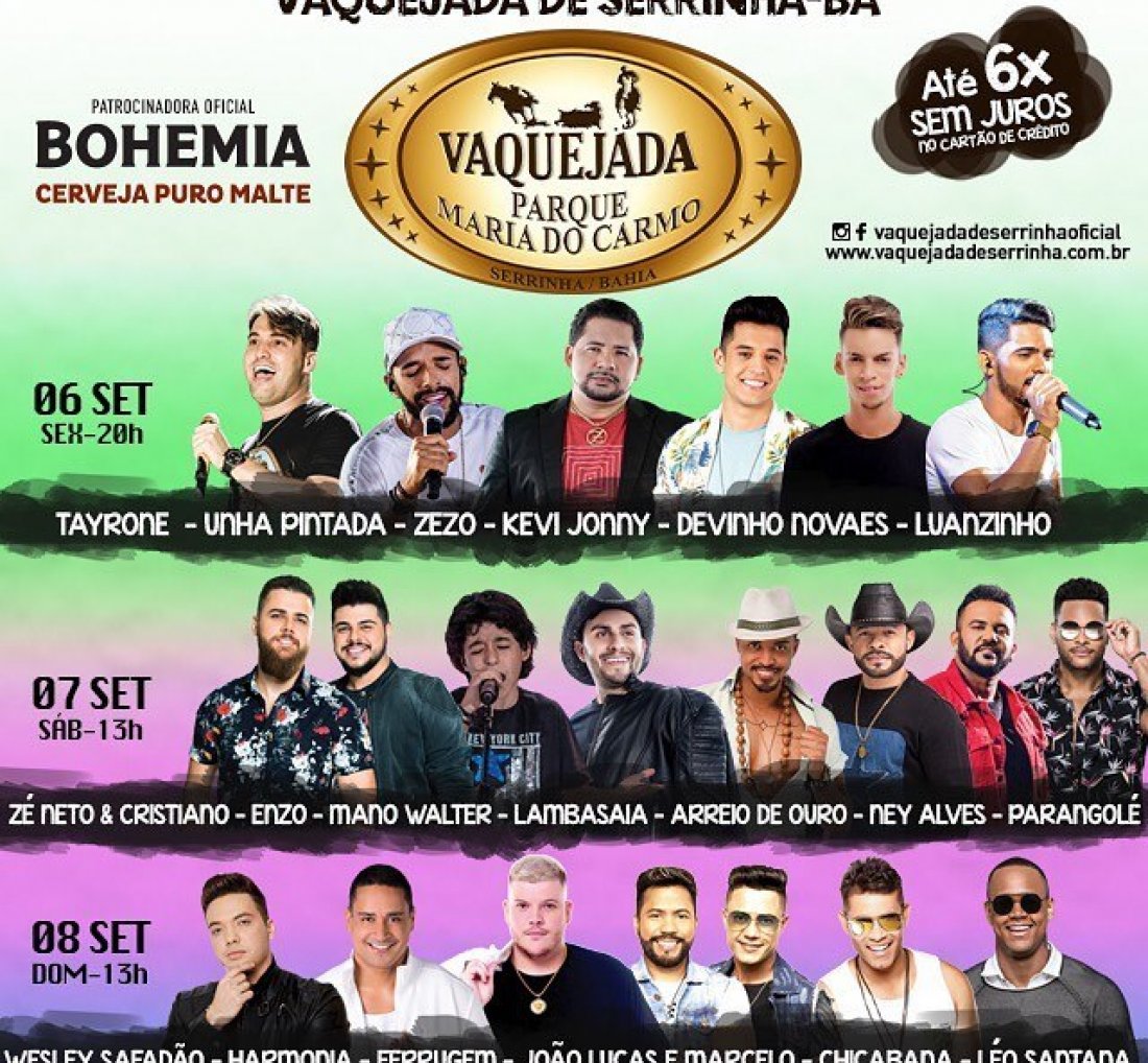 No dia 08 de setembro, a tradicional vaquejada conta com a animação de Nattan, João Gomes, Wesley Safadão, Nadson o Ferinha e Léo Santana! Já no sábado, Terry, Xand Avião, Bell Marques , Tarcísio do Acordeon, Thiago Aquino, Pablo, Unha Pintada e Zé Vaqueiro vão agitar o Parque de Vaquejada Maria do Carmo, na cidade de Serrinha-BA.