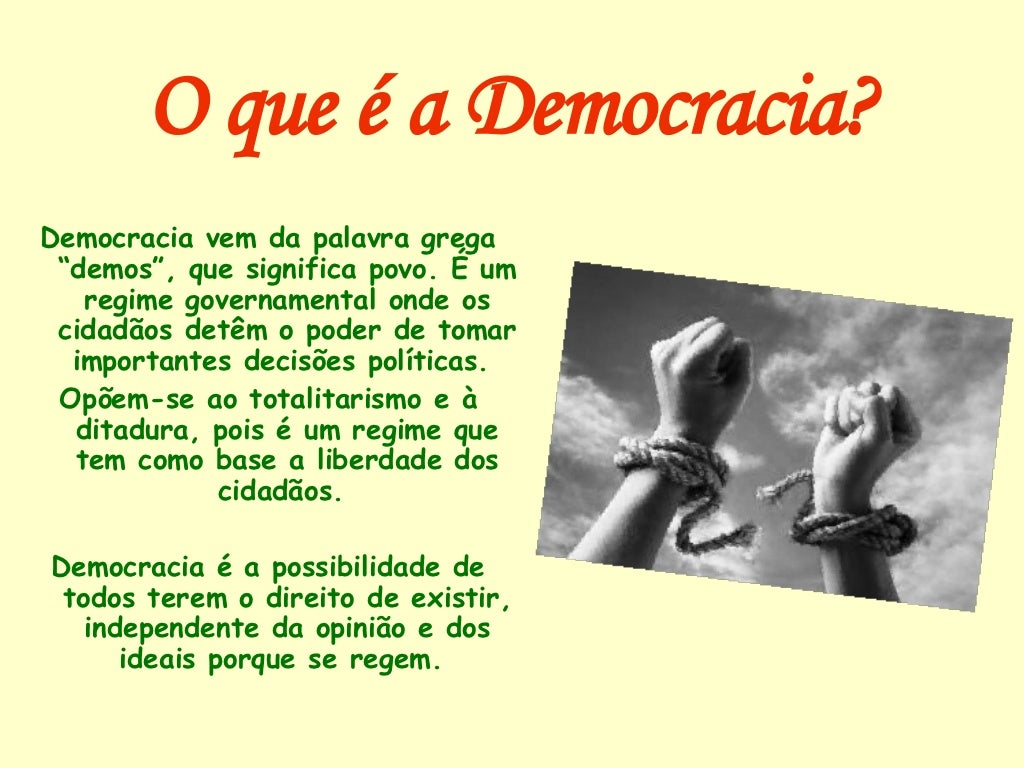 Atenas: berço da democracia grega. Conceito. Do grego demo = povo e Kracia = governo, ou seja, governo do povo. Democracia é um sistema em que as pessoas de um país podem participar da vida política. Esta participação pode ocorrer através de eleições, plebiscitos e referendos. Dentro de uma democracia, as pessoas possuem liberdade de.