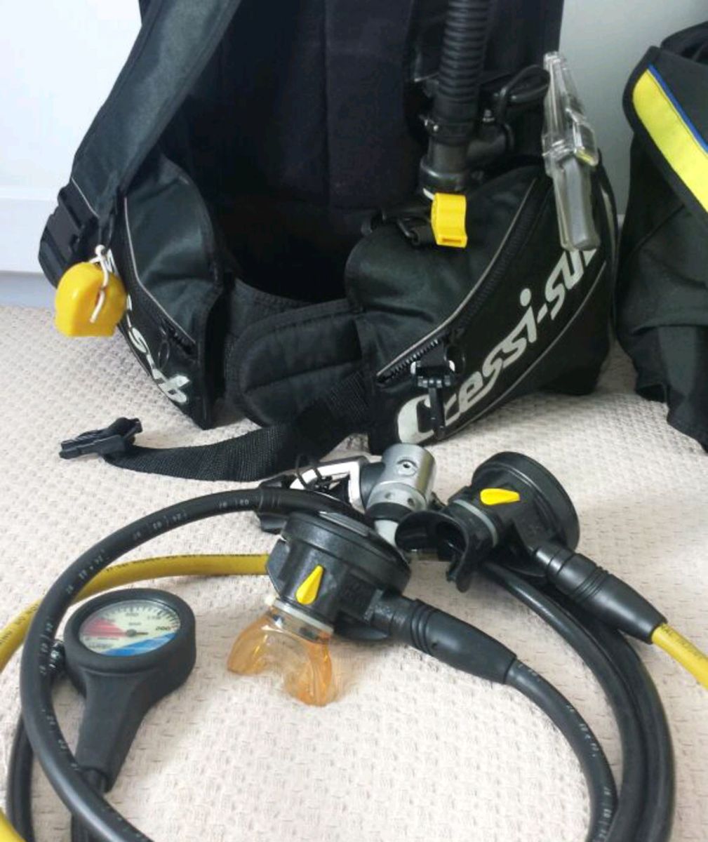 O equipamento de mergulho completo é formado por: Colete equilibrador. Cilindro de ar comprimido. Regulador e Octopus. Profundímetro e manômetro. Roupa de mergulho. Lastro. Máscara de mergulho e snorkel. Nadadeiras. Vamos conhecer um pouco melhor cada uma dessas peças! 1. Colete equilibrador da marca Cressi.