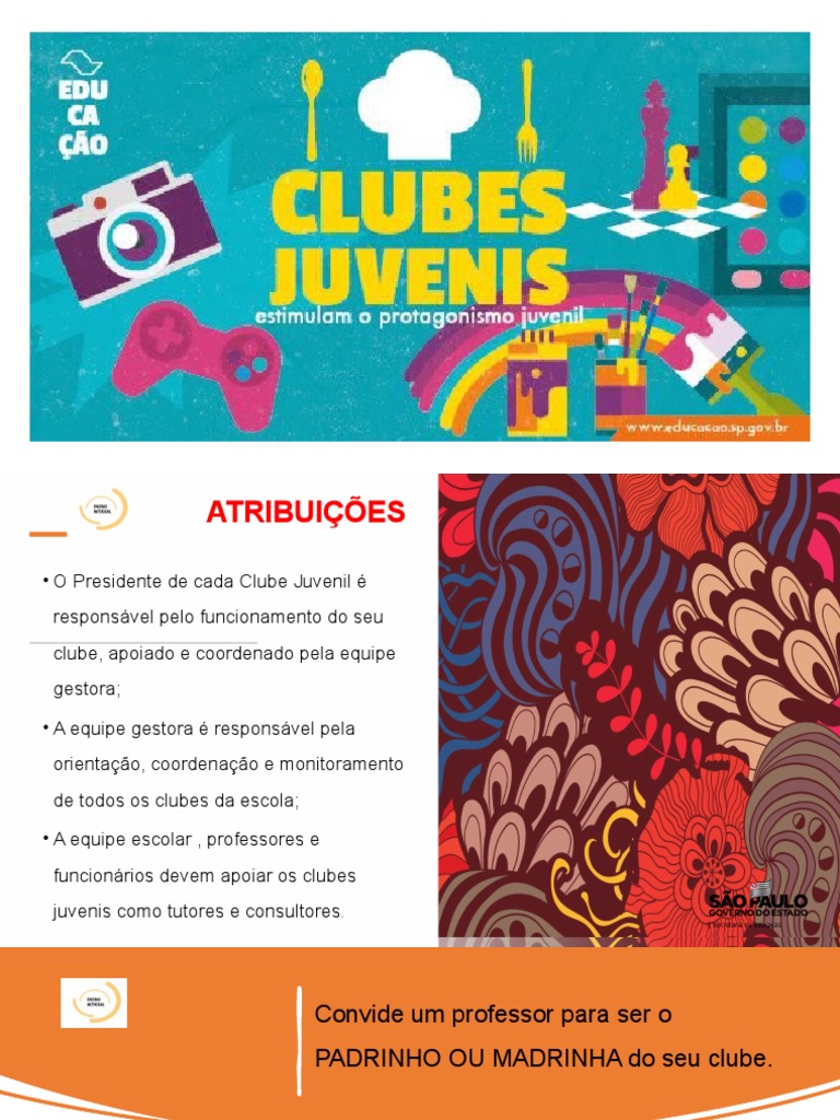 Os Clubes Juvenis são organizados anualmente a partir de um cardápio de opções disponibilizadas pela Seduc/SP aos professores das escolas PEI. III. O acompanhamento das atividades de cada Clube Juvenil é de total responsabilidade do presidente e do vice-presidente de cada Clube, que apresentam o resultado nas reuniões com a direção da.